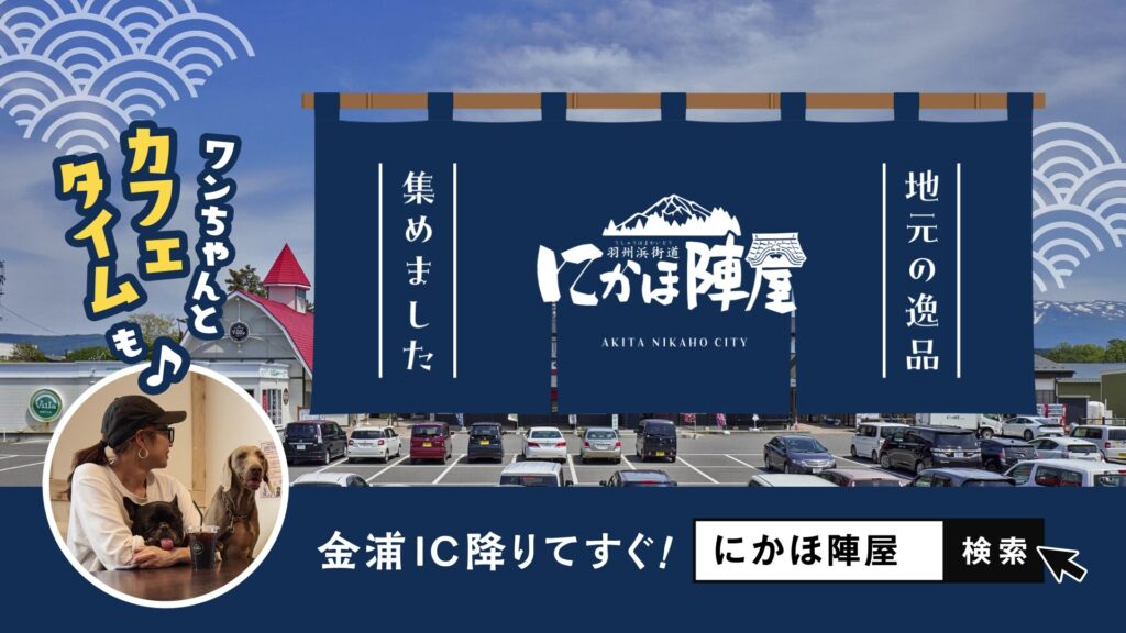 もとよりロードサイド店として、お土産や産直野菜を販売し地域に愛されていたにかほ陣屋様のリニューアルに伴い制作した広告です。地域最大級のドッグランを新たに設置し、人だけでなく、その家族である愛犬とも楽しい時間を過ごすことが出来る場所であることを可愛いワンちゃんの映像と共にアピールしました。
