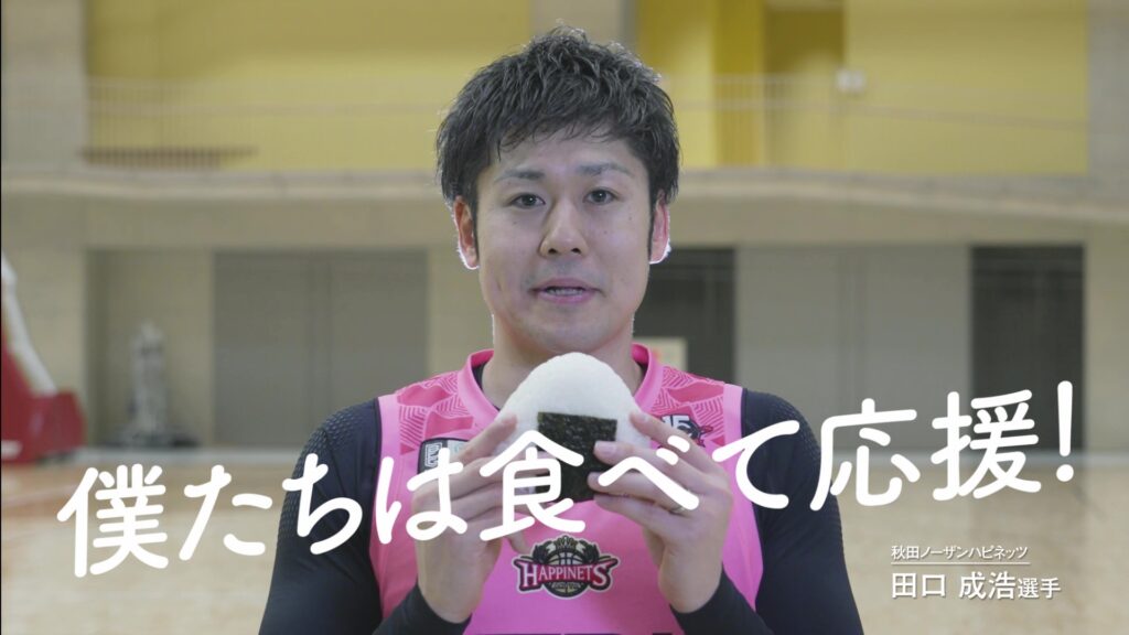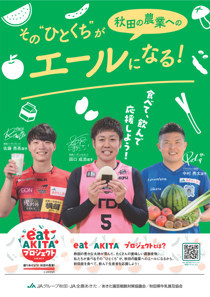 農業を取り巻く環境が厳しさを増す中、持続可能な農業を目指すための生産者と消費者が理解を深め合うコミュニケーションを、秋田県内のプロスポーツチームの選手を起用して実施しました。ノーザンハピネッツの田口選手をはじめ、ブラウブリッツ秋田の中村選手、秋田ノーザンブレッツの佐藤選手など、チームを代表する選手が愛する秋田の農産物と共に出演いただいた企画です。
